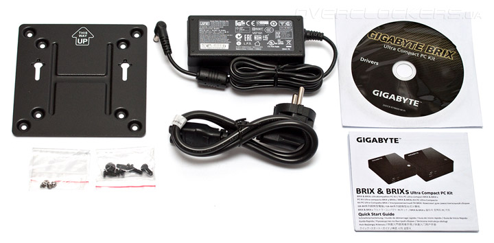 Набор аксессуаров BRIX s не блещет разнообразием, впрочем, в комплекте поставки есть все необходимое, в том числе крепление на стандартный кронштейн VESA, что позволяет превратить практически любой ЖК-монитор в подобие моноблока.