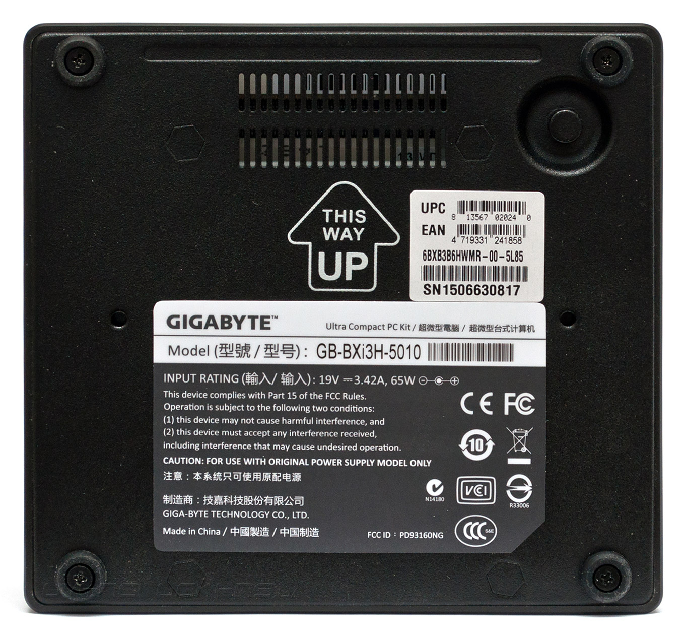 C обратной стороны корпус закрывает металлическая крышка, в которой проделаны вентиляционные отверстия. На нее наклеены стикеры с наименованием модели и ее серийным номером.