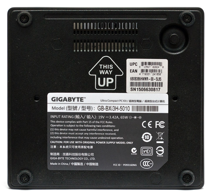 Нижняя крышка корпуса одновременно служит шасси для установки дискового накопителя, поддерживаются модели толщиной 7 и 9 мм. Что касается эффективности отвода избыточного тепла, то винчестерам, а тем более экономичным SSD, вряд ли будет неуютно внутри GB-BXi3H-5010 учитывая обилие вентиляционных отверстий.