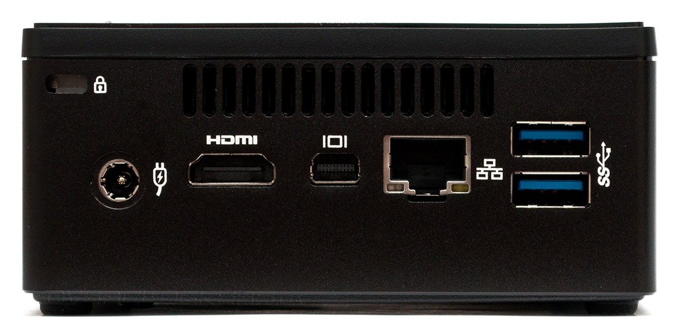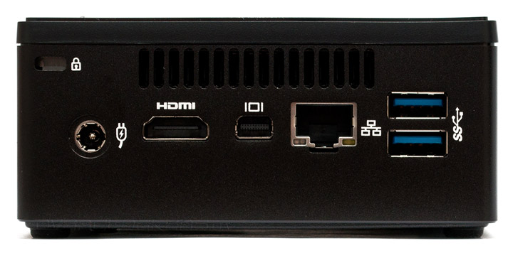 На задней панели BRIX s находится паз для замка Kensington, разъем подключения внешнего блока питания, цифровые видеовыходы HDMI 1.4 и Mini DisplayPort (оба с поддержкой вывода изображения в формате 4К), сетевая розетка RJ-45 и два порта USB 3.0.
