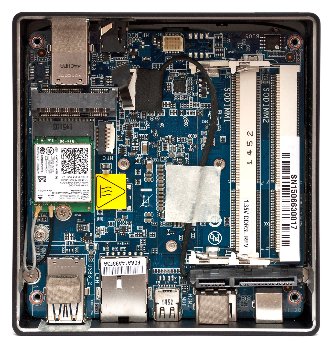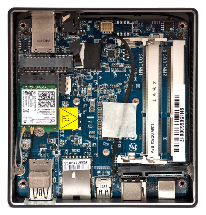 Внутри корпуса находится материнская плата, оснащенная двумя слотами SO-DIMM для инсталляции оперативной памяти стандарта DDR3L с частотой 1333/1600 МГц и суммарным объемом до 16 ГБ. Для организации дисковой подсистемы можно установить твердотельный накопитель в соответствующий разъем mSATA, либо подключить SSD или винчестер формата 2,5″ при помощи специального шлейфа, который в транспортировочном состоянии приклеен к поверхности системной платы скотчем, а сам разъем SATA покоится под слотами ОЗУ. Для установки плат расширения служит единственный порт M.2, занятый адаптером Intel Dual Band Wireless-AC 3160, который обеспечивает поддержку беспроводных сетей Wi-Fi (IEEE 802.11a/b/g/n+ac) и Bluetooth V4.0. Звуковая подсистема GB-BXi3H-5010 базируется на четырёхканальном HD-аудиокодеке Realtek ALC283, а за функционирование сети Gigabit Ethernet отвечает контроллер Realtek RTL8111G.