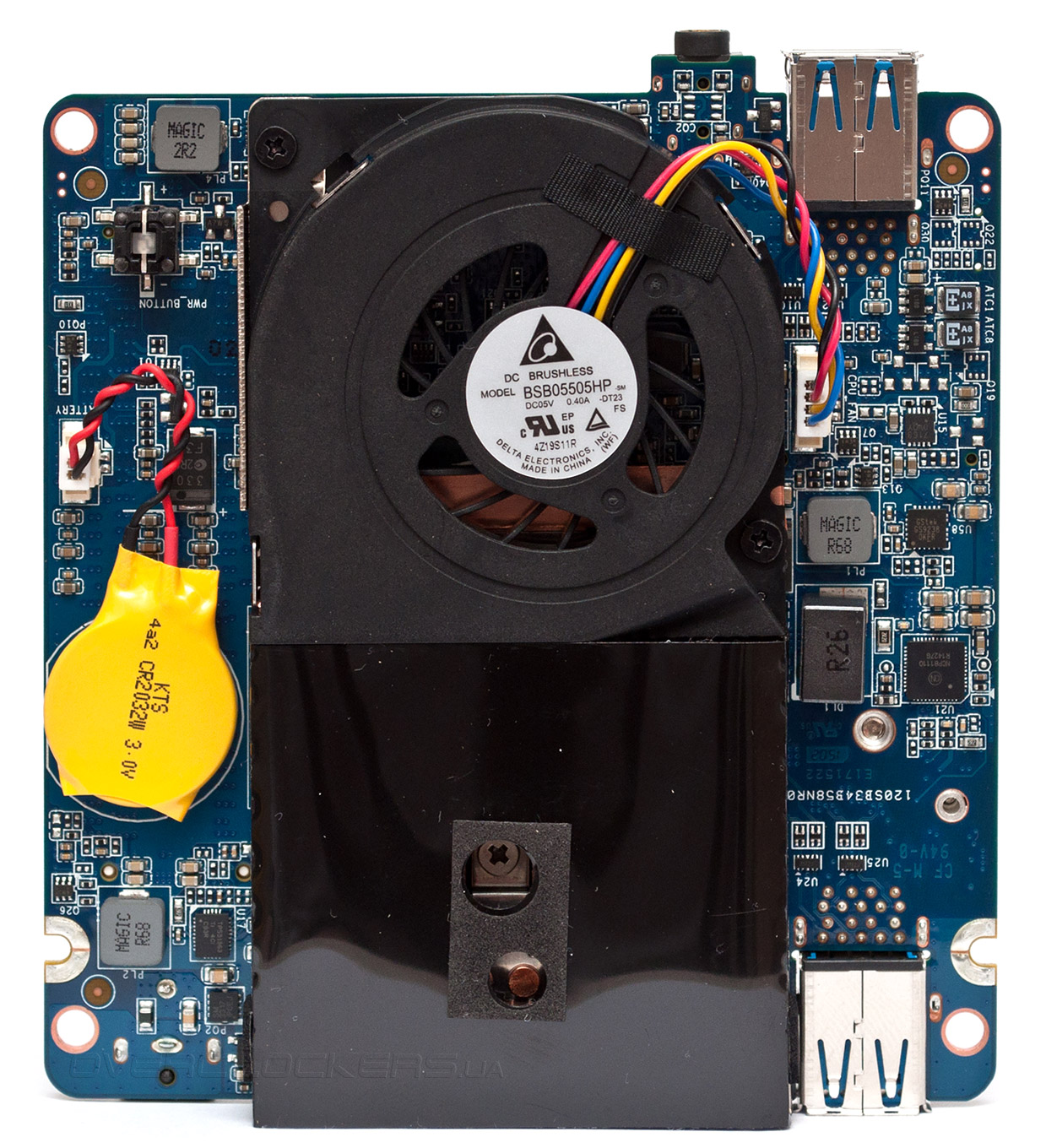 Большую часть обратной стороны «материнки» занимает система охлаждения центрального процессора, состоящая из радиатора и 40-мм «турбины» Delta BSB05505HP с четырехпроводным подключением и поддержкой PWM-управления.