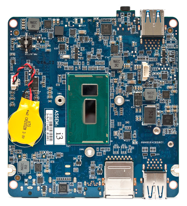 Основой GB-BXi3H-5010 служит энергоэффективный процессор Intel Core i3-5010U в конструктивном исполнении BGA1168, который базируется на 14-нм ядре Broadwell. Вместе с CPU на органической подложке находится микросхема PCH, отвечающая за работу портов ввода-вывода, в том числе четырех каналов USB 3.0, такого де же количества интерфейсов SATA 6 Гбит/с и четырёх линий PCI-E 2.0.