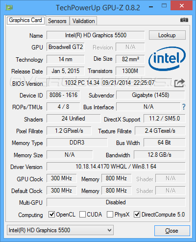 В состав CPU входит графический ускоритель Intel HD Graphics 5500, в котором насчитывается 24 унифицированных шейдерных процессоров, четыре блока растеризации и восемь текстурных юнитов. Тактовая частота встроенной видеокарты варьирует от 300 до 900 МГц в зависимости от нагрузки, поддерживается ускорение кодирования видео Quick Sync и технология Flexible Display, позволяющая отображать разные картинки на двух мониторах, функции Wireless Display и InTRU 3D, а также вывод изображения с разрешением 4К.