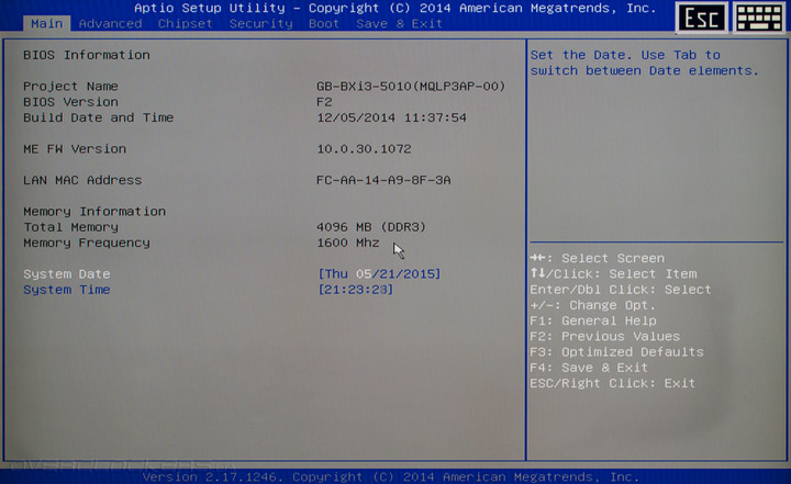 Компактный системный блок Gigabyte оснащается прошивкой UEFI на базе управляющего микрокода AMI, причем, производитель оставил стандартную утилиту Aptio в качестве меню настройки. В структуре UEFI Setup насчитывается шесть вкладок, на первой — Main — выводится информация о версии управляющего микрокода и МАС-адресе сетевого адаптера, отображаются сведения о режиме работы подсистемы ОЗУ, а также задаются дата и время.