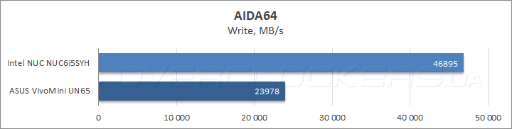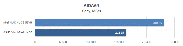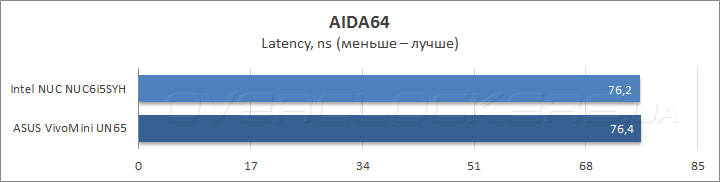 Открывает наше тестирование измерение пропускной способности ОЗУ в программе AIDA64, которое показало 30% преимущество DDR4 при чтении и копировании, тогда как в операциях записи результаты Intel NUC ровно вдвое выше, чем у ASUS VivoMini, что, очевидно, объясняется наличием кэша L4 в составе процессора Intel Core i5-6260U. В то же время латентность совершенно не изменилась, что не может не радовать.