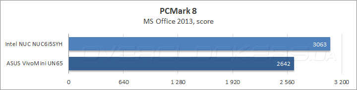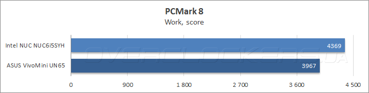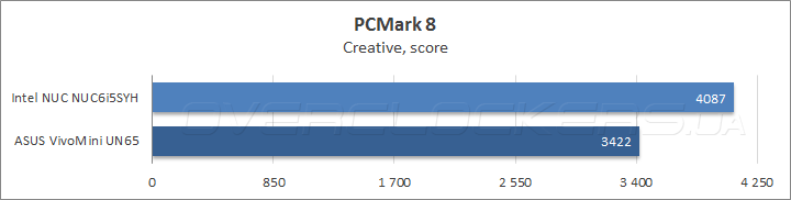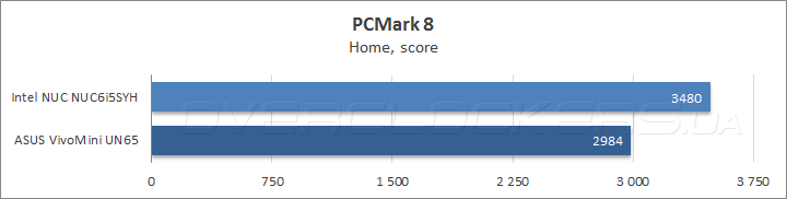 В популярном бенчмарке Futuremark PCMark 8, который отражает быстродействие систем при выполнении повседневных задач, NUC6i5SYH обошел мини ПК от ASUS в среднем на 15%, а подтесте Creative выигрыш достиг 20%. Что касается сценария Storage, то SSD Kingston SM2280S3G2/240G, которым был оснащен NUC, оказался проворнее накопителя SK Hynix HFS128G39MNC-2300A, установленного в VivoMini UN65, хотя разница совсем невелика.