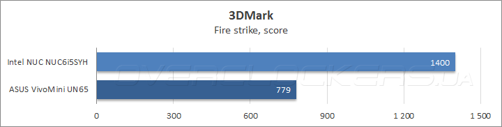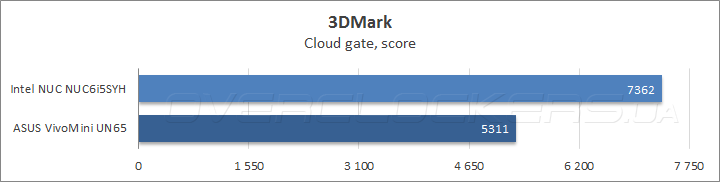 Что касается игровой производительности, то результаты в Futuremark 3DMark красноречиво говорят сами за себя: в тяжелых сценариях Fire strike и Sky diver преимущество старшего Intel NUC над ASUS VivoMini UN65 достигло 80% и 60% соответственно, а в сравнительно нетребовательном к графической подсистеме подтесте Cloud gate выигрыш приблизился к 40%.