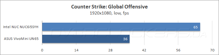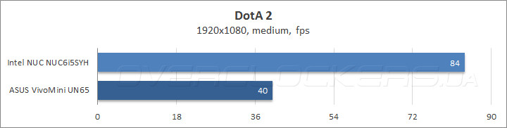 Ничуть не хуже, чем в синтетике проявил себя NUC6i5SYH в популярных играх Counter Strike: Global Offensive, DotA 2 и World of Tanks: средний fps оказался в два и более раз выше, чем у визави, а частота смены кадров оказалась так высока, что впору задуматься о повышении уровня настроек качества минимум на одну ступень. Конечно, нельзя сказать, что Intel NUC «по зубам» любой современный игровой проект, но, по сравнению с большинством устройств аналогичного класса — это значительный шаг вперед по части быстродействия графической подсистемы!