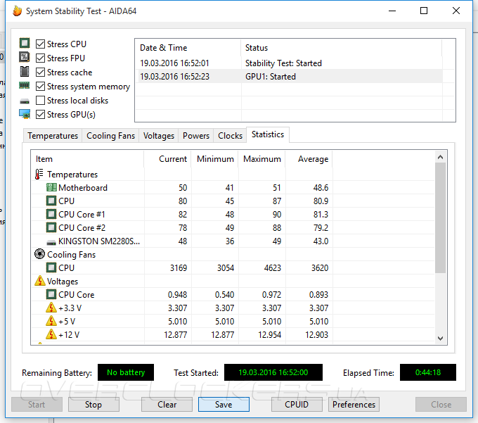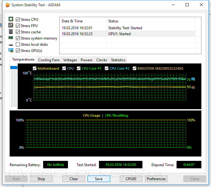 Для оценки эффективности системы охлаждения нами использовался стресс-тест, встроенный в информационно диагностическую утилиту AIDA64. Выбор обусловлен тем, что данный бенчмарк создает одновременную нагрузку на графическую и вычислительную подсистемы, а также снабжен удобными инструментами мониторинга. По результатам 45-минутной работы стресс-теста температура центрального процессора достигла 90°С, но режим пропуска тактов так и не включился, так как до критического значения в 100°С еще оставался приличный запас.