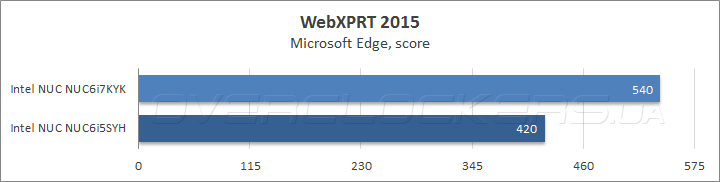В свете бурного развития облачных технологий было проведен тест WebXPRT 2015, которые отлично подходят для оценки быстродействия при работе с Web-приложениями. Для запуска бенчмарка использовался штатный браузер Windows 10 — Microsoft Edge.