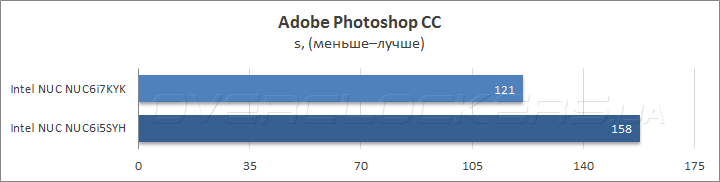 Результаты в комплексном тестовом пакете PCMark 8 показывают, что наибольшего прироста NUC6i7KYK достигает в подтесте Creative и сценарии, моделирующем работу в офисном приложении Microsoft Office 2013 — 25% и 32% соответственно. Это можно объяснить поддержкой многопоточных вычислений в данных дисциплинах, тогда как в тестовых трассах Home и Work выигрыши находятся в пределах 10%.