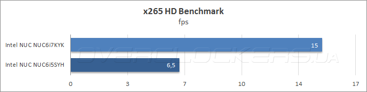 Кодирование HD-видео с помощью кодека Н.265 — еще один тест, демонстрирующий абсолютное — до 2,3 раз — доминирование NUC6i7KYK. Собственно, именно такие результаты мы и ожидали, сравнивая процессор для настольных систем с энергоэффективным чипом, рассчитанным на применение в составе мобильных устройств.