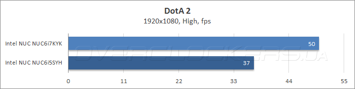 В мега-популярных Counter Strike: Global Offensive и DotA 2, которые уже получили статус официальных киберспортивных дисциплин, оба Intel NUC обеспечили приемлемую частоту смены кадров даже на уровнях детализаций выше среднего, а преимущество NUC6i7KYK оставило 26% и 35% соответственно.