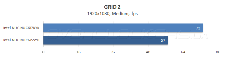 Гоночный симулятор GRID 2 отлично идет на обоих компактных ПК со средними настройками, а разница в пользу старшего продукта составила 28%.