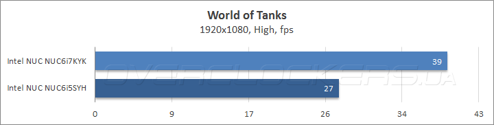Такой же прирост — порядка 40% — продемонстрировал NUC6i7KYK относительно младшей модели и в батальных симуляторах War Thunder и World of Tanks, причем, в последнем случае NUC6i5SYH едва справился с игрой при высоких настройках, тогда как у второго конкурсанта средняя частота смены кадров достигла 40 fps.