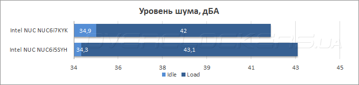 Что касается уровня шума, который был измерен бытовым прибором UNI-T UT352 в тихой комнате с фоном в 33,9 дБА, то в простое и при минимальной нагрузке кулер NUC6i7KYK оставался практически неслышимым, громкость работающего вентилятора не превысила 34,9 дБА, тогда как при активном использовании шум увеличился до некомфортных 42 дБА.