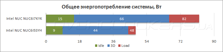 По результатам тестирования максимальная разница в энергопотреблении двух Intel NUC достигла 34 Вт при прохождении стресс-теста, что в принципе близко к отличию в тепловых пакетах используемых процессоров. При отсутствии нагрузки младшая модель оказалась почти вдвое экономичнее, а в играх уровень потребляемой мощности новичка не превысил 66 Вт, тогда как второй участник продемонстрировал потребление электроэнергии около 44 Вт.