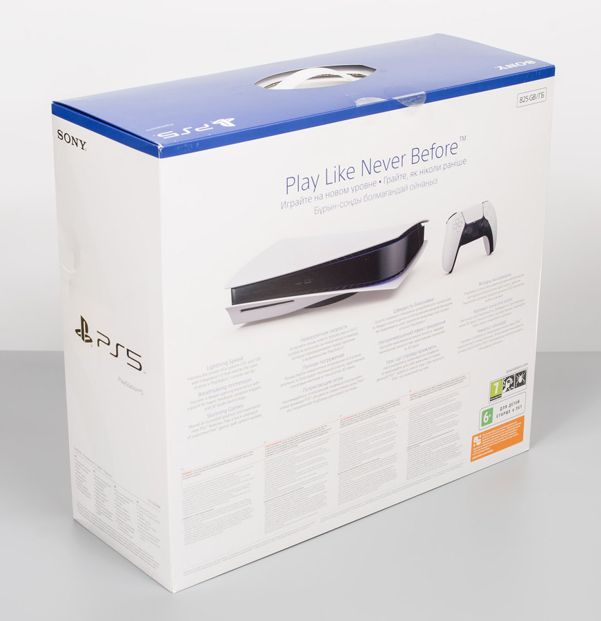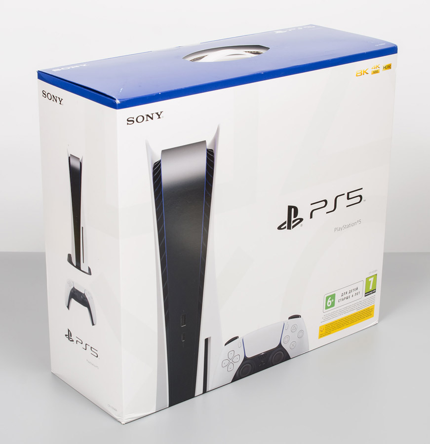 Приставка поставляется в крупной коробке, выполненной в сине-белых тонах, которая для удобства переноски снабжена пластиковой ручкой. Также после покупки с ней будет удобно прогуляться по торговому центру, учитывая ее нынешний тотальный дефицит, — изображение PlayStation 5 явно привлечет к себе внимание заинтересованных лиц.