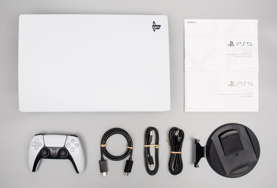 Вскрыв упаковку, новоиспеченный пользователь обнаружит в ней саму консоль, подставку для нее, геймпад нового поколения, кабель USB Type-C/Type-A (2 м), кабель HDMI (2 м), сетевой шнур, краткий справочник и руководство по безопасности.