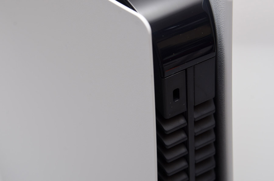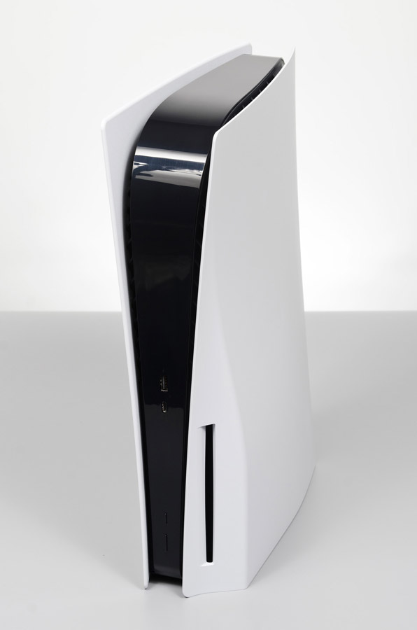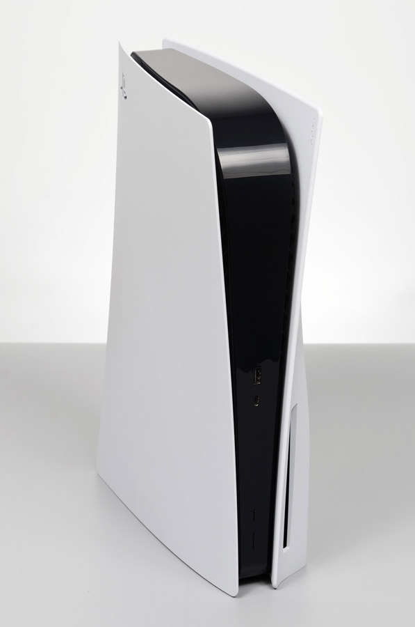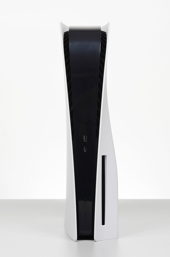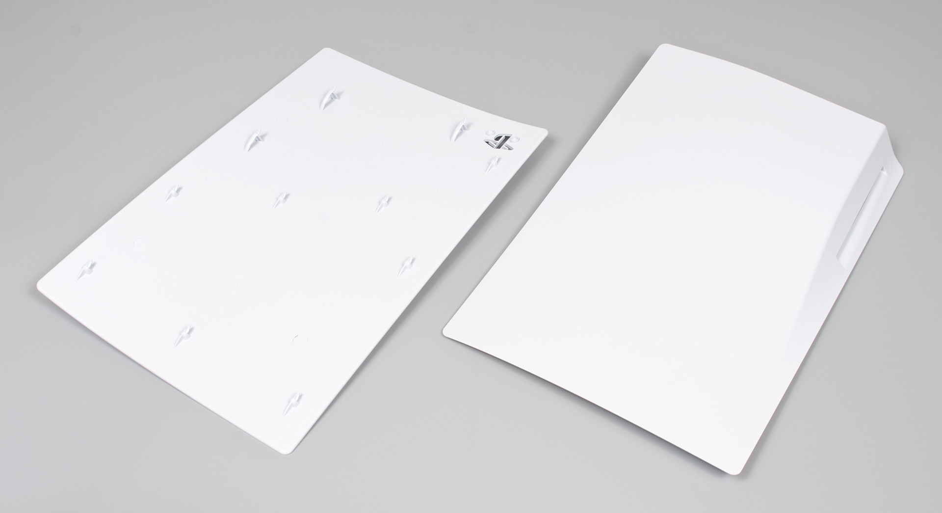 В новой модели пластиковые изогнутые матово-белые (скорее даже с сероватым оттенком) боковые панели разделяются глянцевой черной вставкой с решетками по краям для захвата холодного воздуха, расширяющиеся к верху и с большим радиусом изгиба в этой части. Свежо и ново, но кому-то может не понравиться такой вид, так как PlayStation 5 будет сильно выделяться на фоне остальной техники.