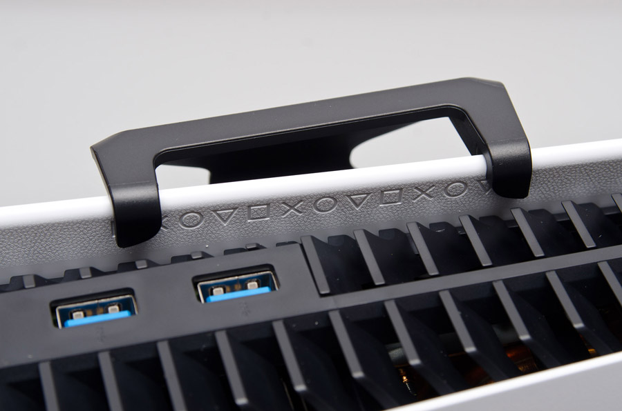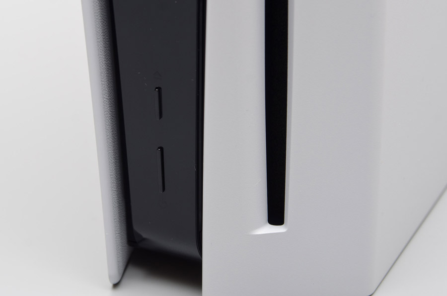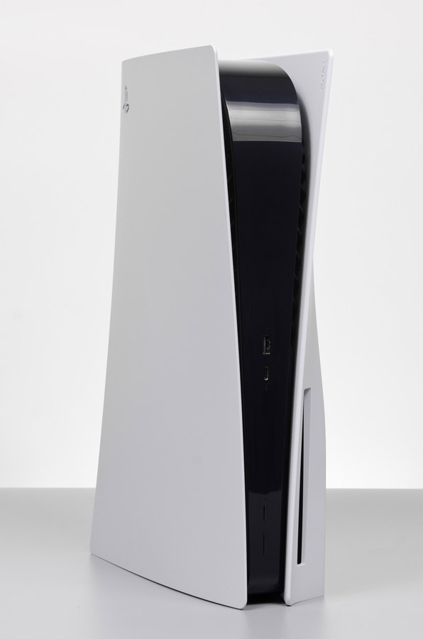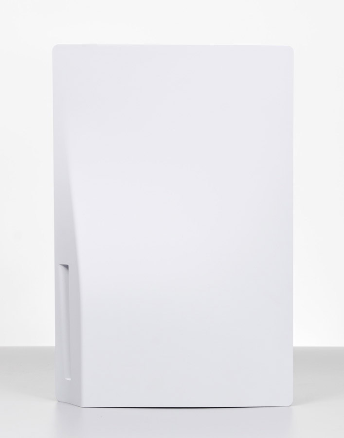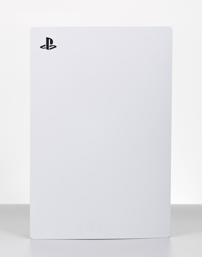 В новой модели пластиковые изогнутые матово-белые (скорее даже с сероватым оттенком) боковые панели разделяются глянцевой черной вставкой с решетками по краям для захвата холодного воздуха, расширяющиеся к верху и с большим радиусом изгиба в этой части. Свежо и ново, но кому-то может не понравиться такой вид, так как PlayStation 5 будет сильно выделяться на фоне остальной техники.