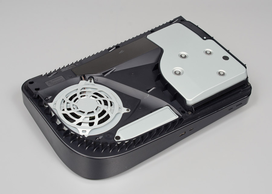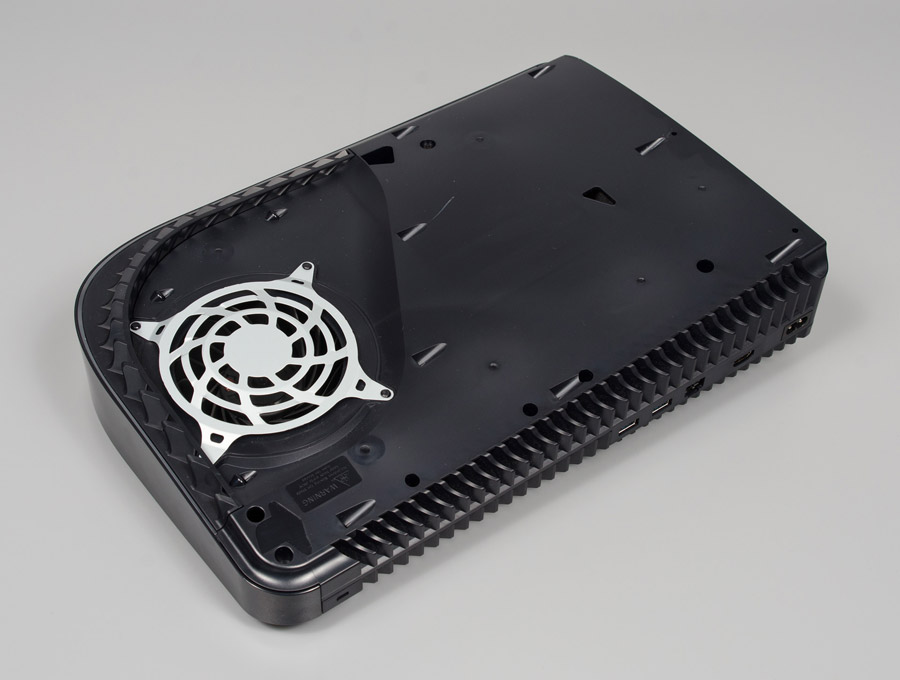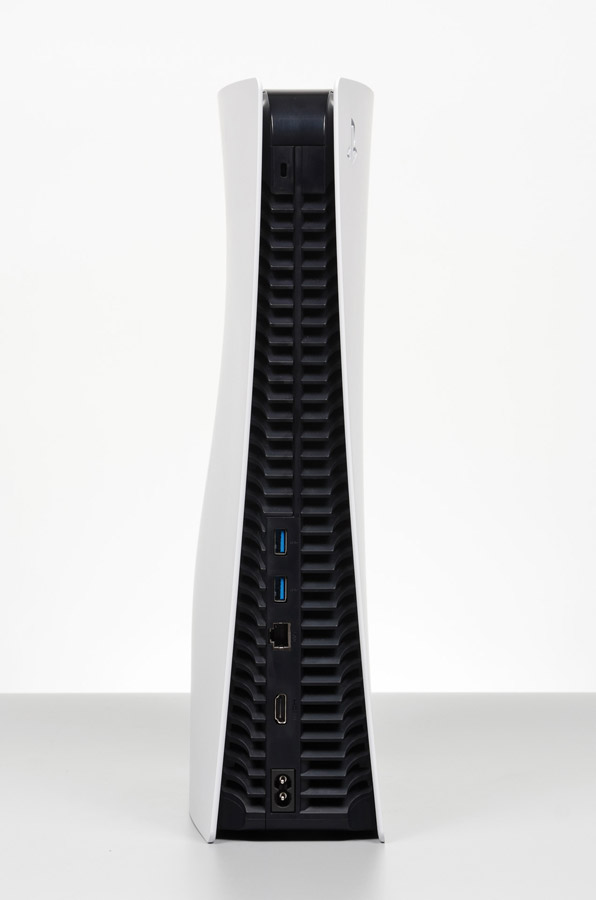 Еще один нюанс в дизайне устройства заключается в приводе дисков Blu-ray, что делает консоль немного «пузатой» справа, тогда как в цифровой версии приставки его нет и ее корпус более симметричен. Задняя часть в виде решетки для выброса нагретого воздуха выполнена из матового пластика и расширяется к низу, где расположены коммуникационные разъемы.
