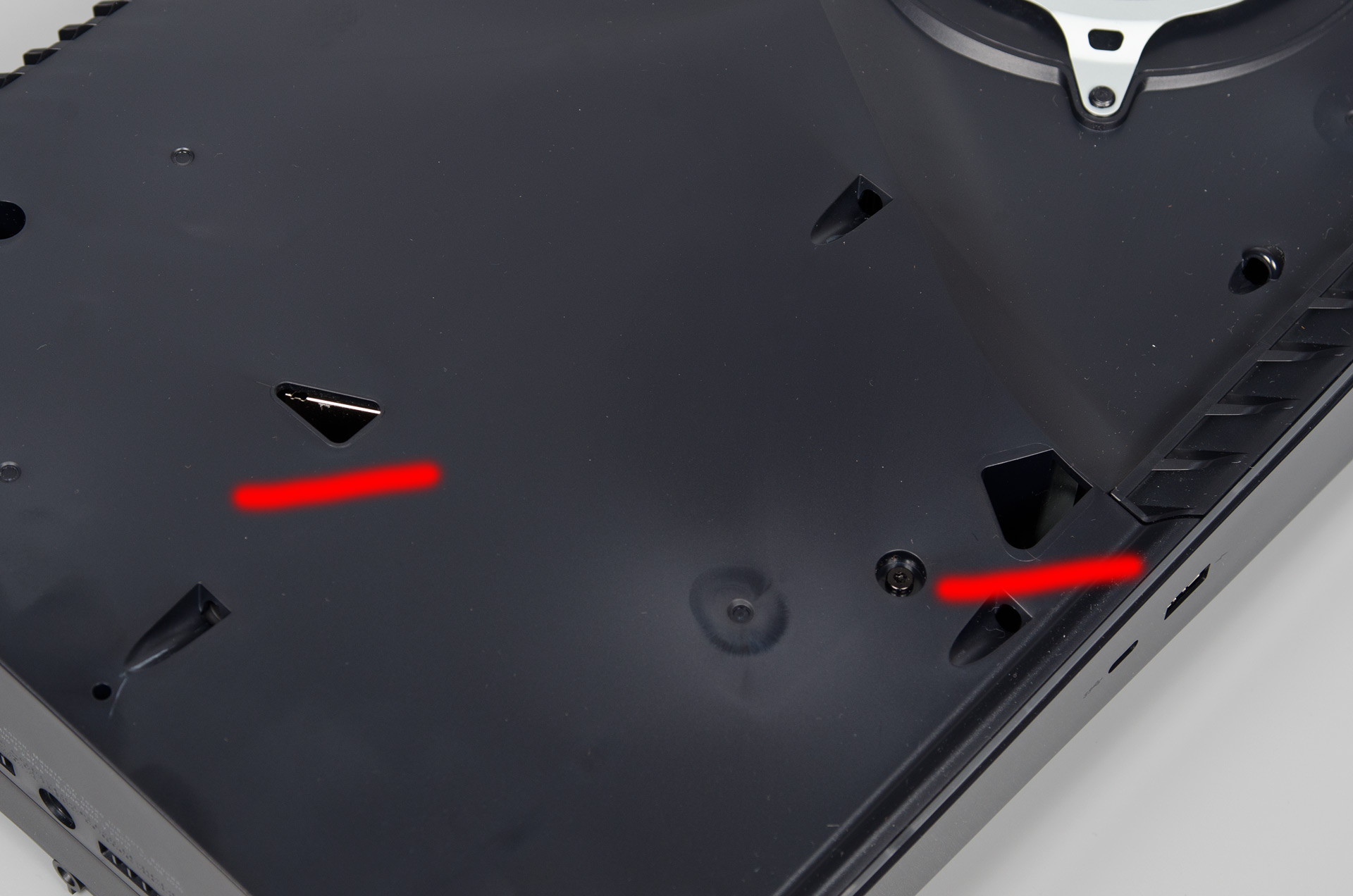 Если консоль понадобится установить горизонтально, а учитывая ее размеры — это весьма заманчивое решение для последующего размещения ее в тумбе, то подставку необходимо будет защелкнуть на боковой стенке со стороны привода в помеченной области, возле USB-портов на задней стенке. В принципе, в таком положении она держится неплохо, но ее легко выломать, если дернуть за основание.