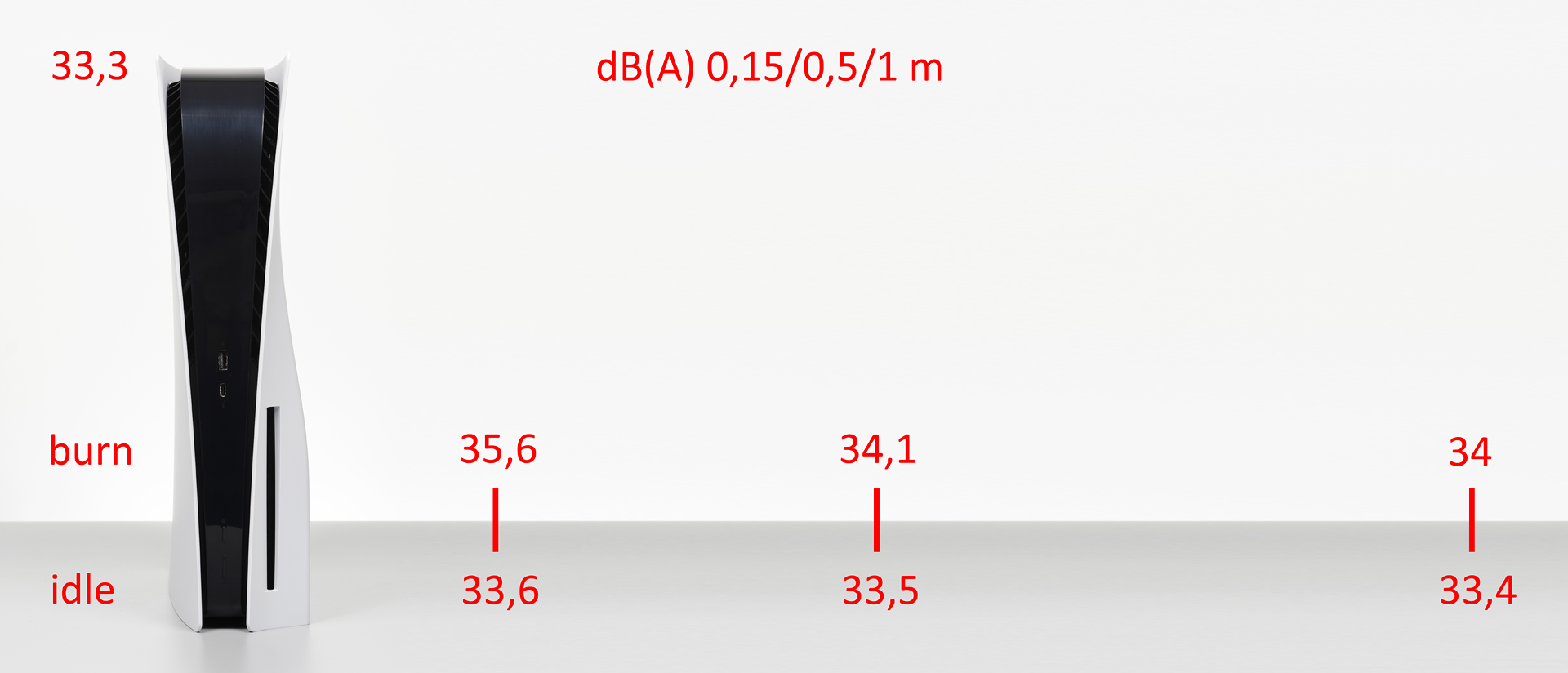 Но можно ограничиться и монитором с большой диагональю или невысоким разрешением. В таком случае, консоль будет находиться близко к пользователю, что повысит требования к ее уровню шума при работе. Для понимания насколько она шумна были проведены замеры прибором UNI-T UT352 во время игры в Spider-Man: Miles Morales с активированным рейтрейсингом на расстоянии 0,15, 0,5 и 1 м от консоли при уровне шума в помещении около 33,3 дБ(А).