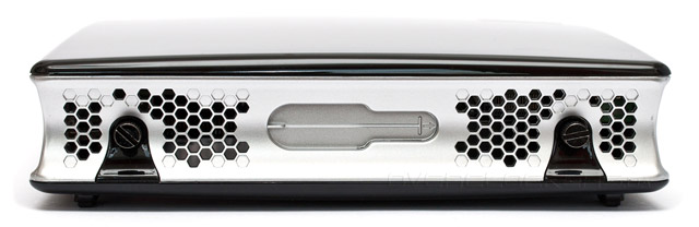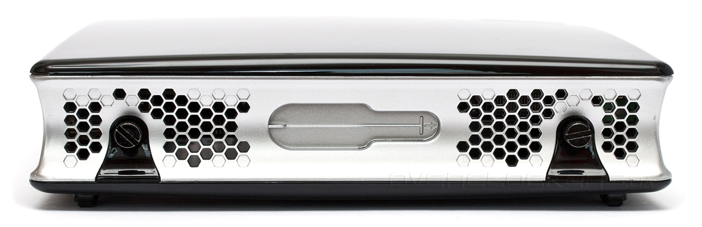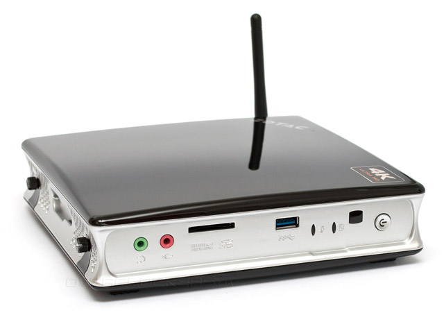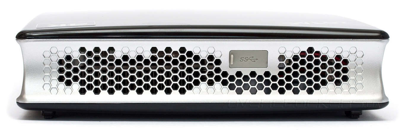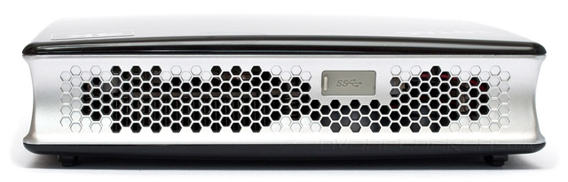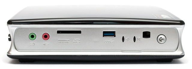 На передней панели новинки расположены два аналоговых аудиоразъема, слот считывателя флэш-карт SD/SDHC/SDXC/MMC, порт USB 3.0, индикаторы активности беспроводной сети и жесткого диска, а также кнопка включения и окошко ИК-приемника. Последний предназначен для работы мультимедийных пультов дистанционного управления, но ни в руководстве пользователя, ни на сайте производителя нет рекомендаций по выбору совместимых моделей.