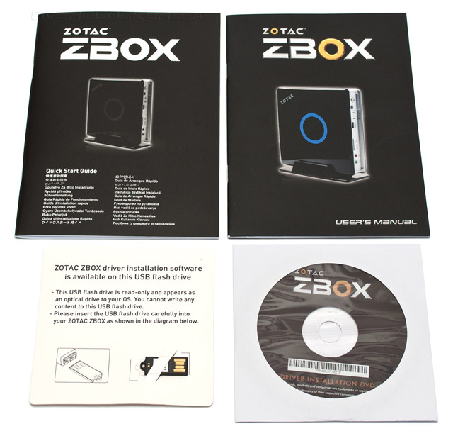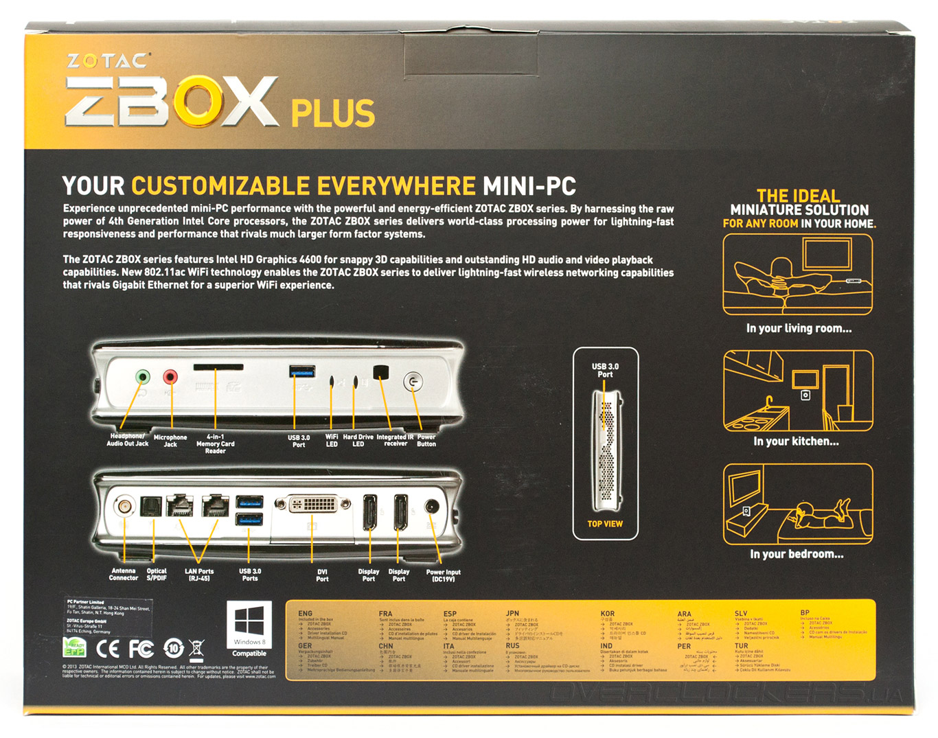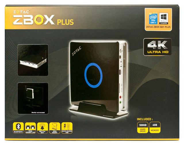 Устройство поставляется в крупной картонной коробке, размеры которой напоминают об упаковке старших графических акселераторов. Её дизайн выдержан в единой для всех продуктов Zotac цветовой гамме, на лицевой поверхности показан внешний вид устройства, представлены варианты размещения, перечислены некоторые из возможностей расширения, а также указаны параметры предустановленного винчестера и оперативной памяти. Логотип 4K Ultra HD говорит о поддержке ZBOX IQ01 Plus видео сверхвысокого разрешения, а значок Windows 8 Compatible — о полном соответствии аппаратного обеспечения требованиям новейшей ОС от Microsoft.