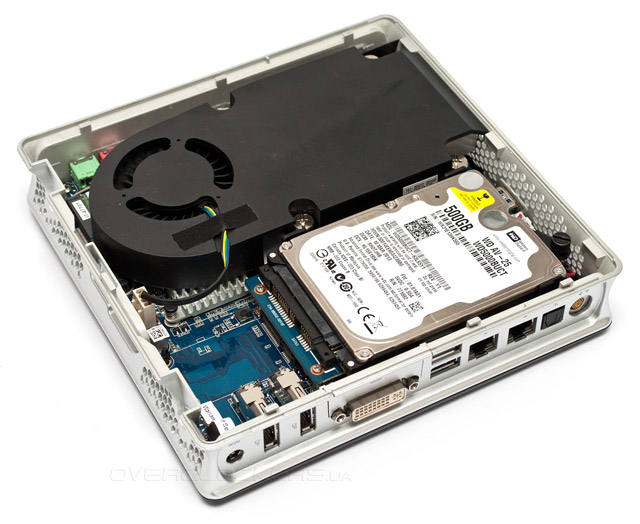 После снятия нижней крышки, становится видно внутреннее устройство неттопа. Большую часть пространства занимает система охлаждения турбинного типа, накрытая пластиковым кожухом, место рядом с ней отведено для установки запоминающего устройства.