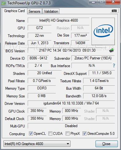 Intel Core i7-4770T оснащен интегрированным ядром HD Graphics 4600, которое состоит из 20 унифицированных шейдерных процессоров, четырех текстурных модулей и двух блоков растеризации. Графический ускоритель совместим с DirectX 11, поддерживаются API OpenCL и DirectCompute 5.0, дающие прирост быстродействия в неграфических вычислениях. Базовая частота для встроенной видеокарты составляет 350 МГц, но за счет динамического управления энергопотреблением интегрированное видеоядро может ускоряться до 1200 МГц при условии, что суммарное тепловыделение остается в пределах TDP 45 Вт.