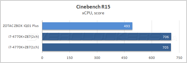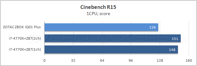 При построении трехмерных изображений в программе Cinbench R15 отставание ZBOX IQ01 Plus ощутимо, тестовый стенд на базе Intel Core i7-4770K демонстрирует преимущество около 15% в однопоточном тесте, тогда как при задействовании всех вычислительных ядер выигрыш достигает 30%. Но не стоит забывать, что частота используемого процессора в неттопе на 1 ГГц ниже, чем старшей модели.