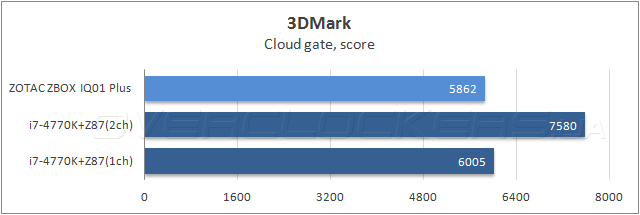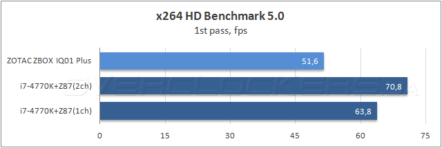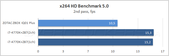 Поскольку тактовые частоты встроенных графических ядер обеих платформ примерно равны, результаты обоих подтестов находятся на одном уровне. Активация второго канала ОЗУ дает тестовому стенду ощутимый прирост быстродействия, скорее всего, эффект от дооснащения ZBOX IQ01 Plus второй «планкой» памяти будет примерно таким же.