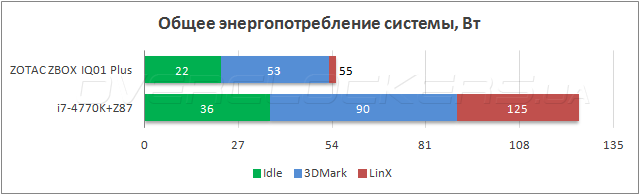 В данном случае полная и безоговорочная победа достается Zotac ZBOX IQ01 Plus. Тестовый стенд, собранный на базе процессора Intel Core i7-4770К, при прохождении стресс-теста LinX потребляет до 125 Вт, тогда как его визави — в 2,5 раза меньше. То же самое касается работы 3DMark, создающего нагрузку на графическую подсистему, а в простое неттоп оказался на треть экономичнее второго участника. В этом несомненная заслуга комплектующих, которые подобраны с учетом минимального энергопотребления, а также прошивки, эффективно реализующей работу технологий энергосбережения.