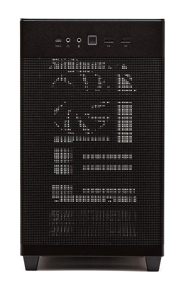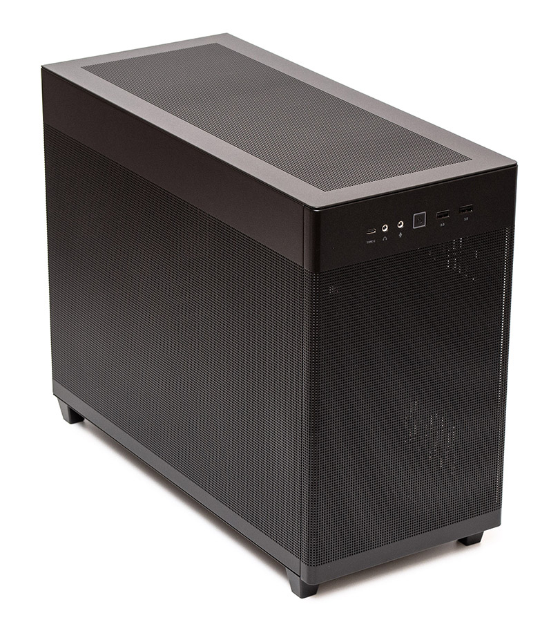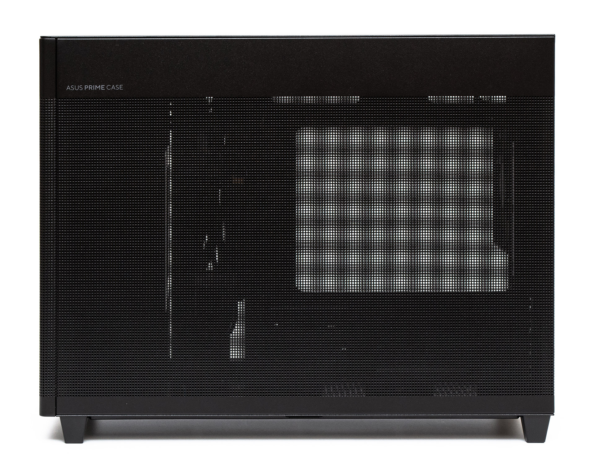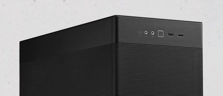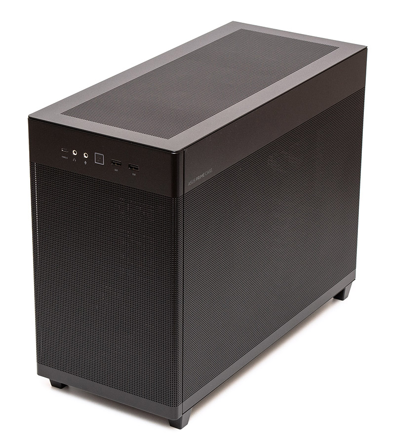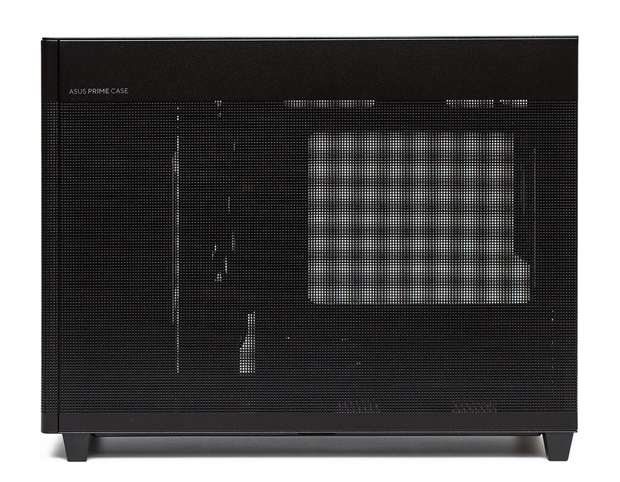 ASUS Prime AP201 виглядає «квадратно» та практично. Він майже повністю сталевий, а основна фішка корпусу — це решітчасті панелі з усіх сторін. Може бути пофарбований у чорний або білий колір. Отже, фронтальна панель рівна, із заокругленням по боках. Переважна її частина вкрита отворами вентиляційної сітки, а цільною є лише смуга металу зверху, де розташовані зовнішні порти.