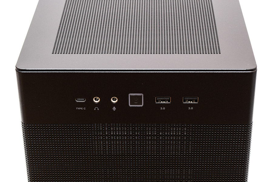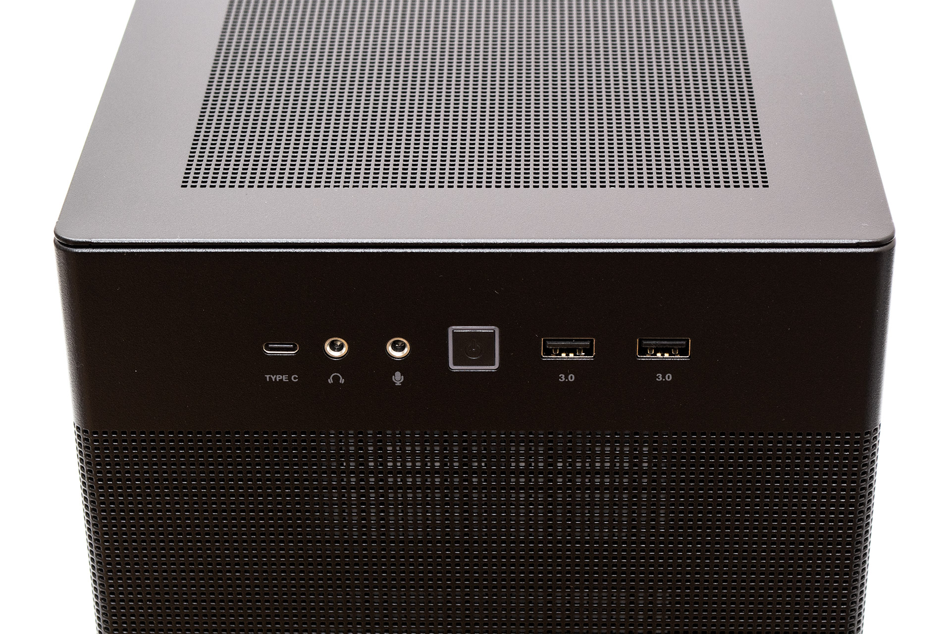 Зліва направо тут облаштований порт USB 3.2 Gen2 Type-C, два 3,5-мм входи для навушників та мікрофону, невелика квадратна кнопка запуску ПК з білим індикатором живлення по периметру та два порти USB 3.2 Gen1.
