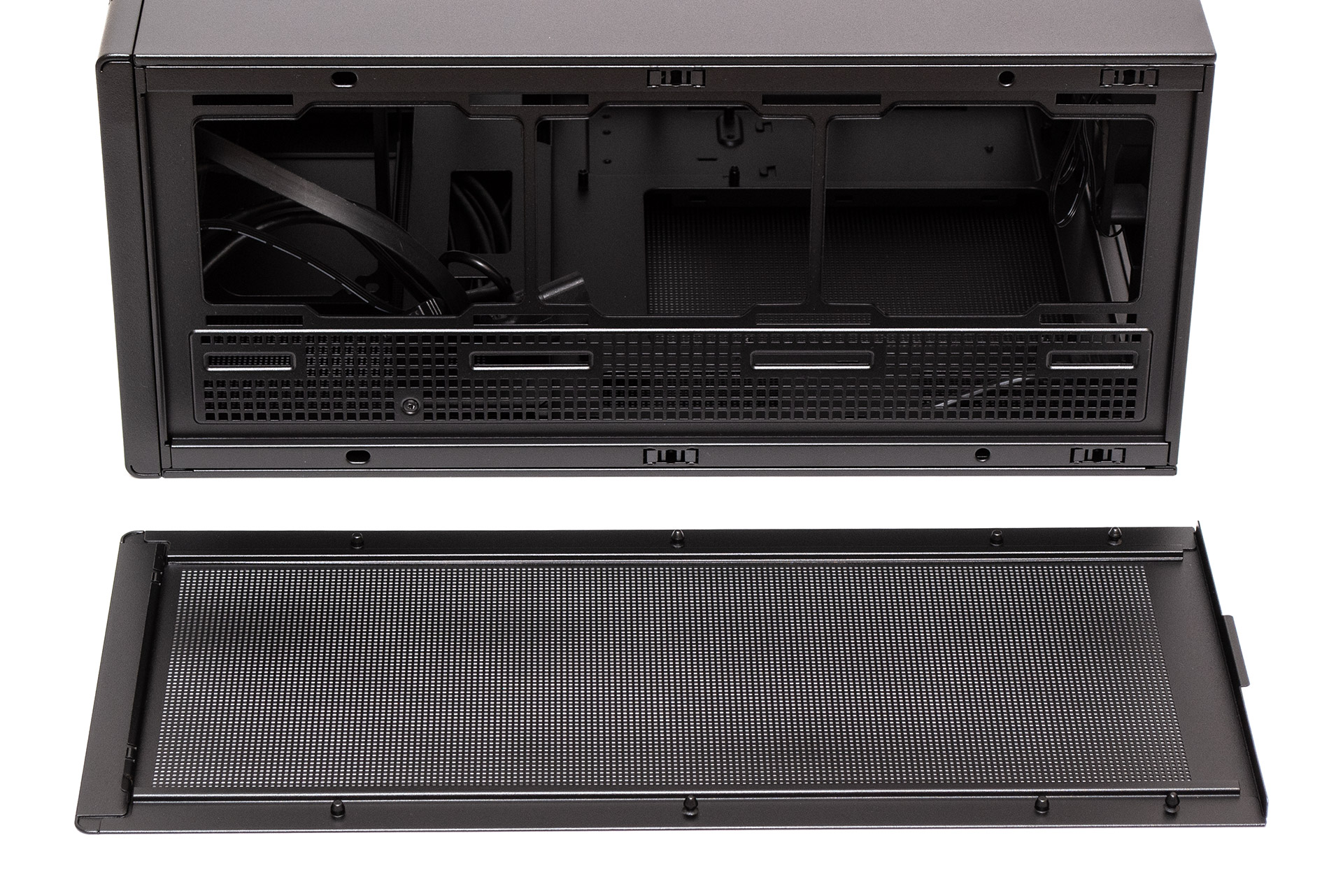 Під фільтром бачимо вже звичну решітку з посадковими отворами під два 120-мм вентилятори (поряд, у задній частині), та два 2,5″ або 3,5″ накопичувача (попереду та позаду). Пластикові ніжки з гумовими наліпками знизу розташовані по кутах та мають висоту у 25 мм.