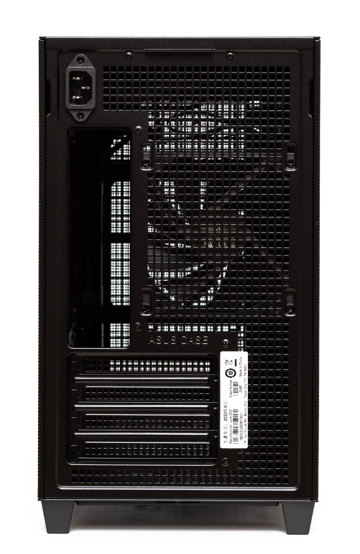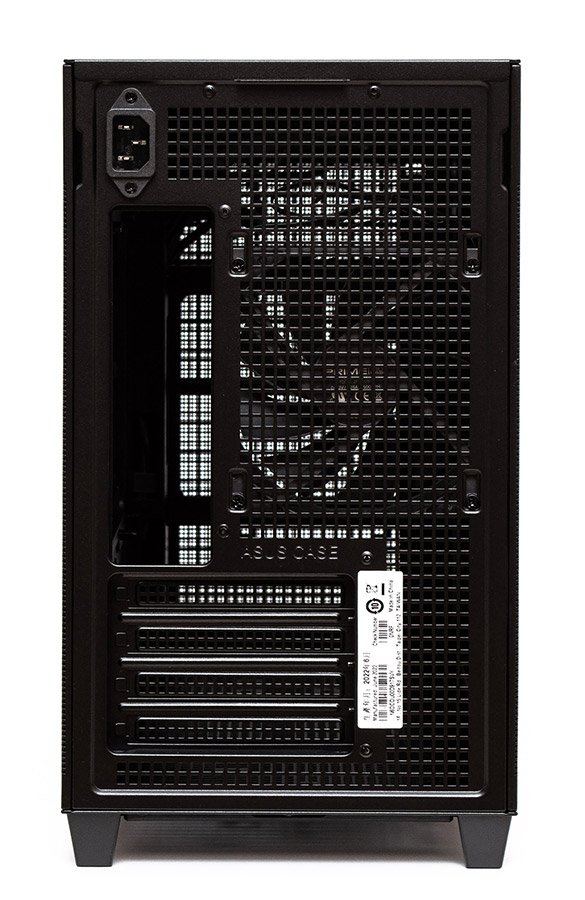 Задня панель також повністю проникна для доступу повітря. Зверху, замість блока живлення, є лише роз’єм для підключення силового кабелю. З чого легко зробити висновок, що БЖ має бути розташований десь у середині. Трохи нижче є посадкові отвори під 120-мм вентилятор, з можливістю регулювання висоти його кріплення в межах 10 мм. І зовсім внизу, на звичному місці, можна побачити чотири багаторазові вентильовані заглушки карт розширення PCI-E.