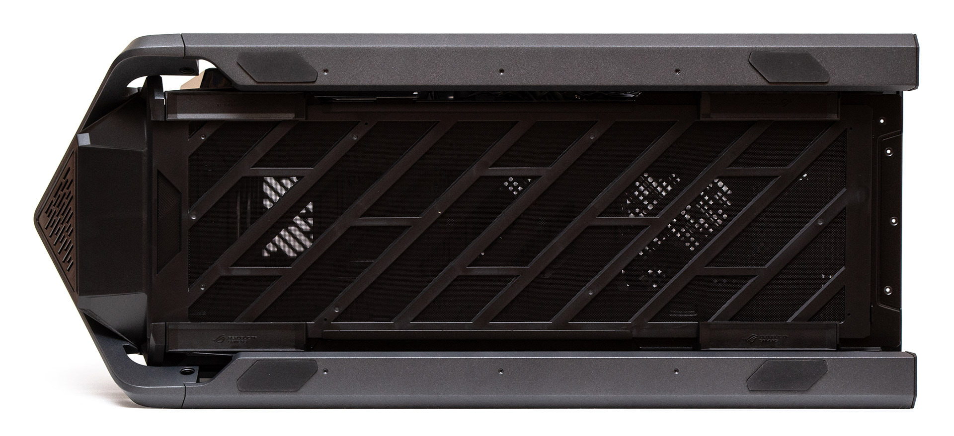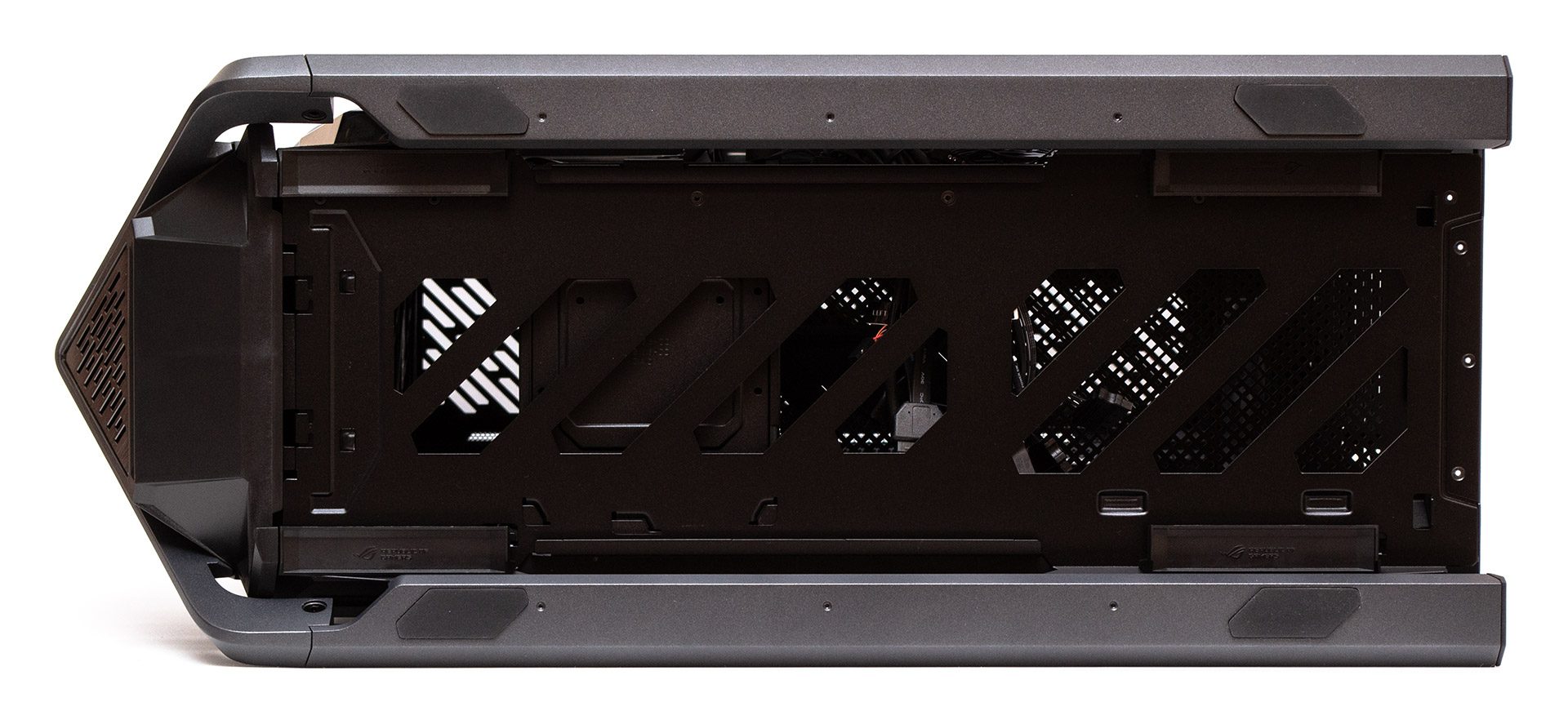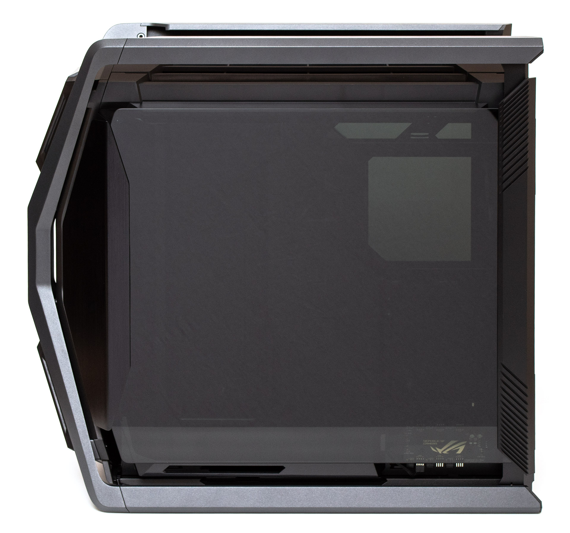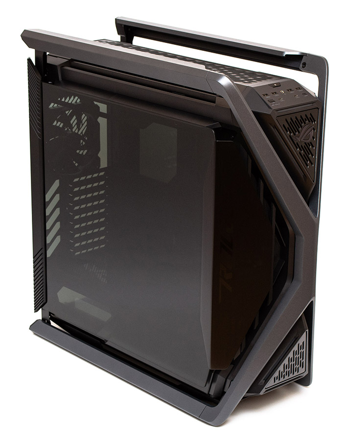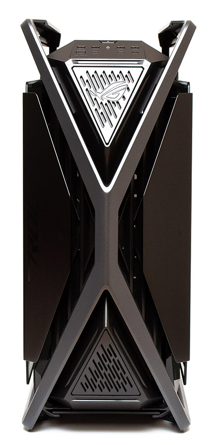 ASUS ROG Hyperion GR701 має дуже футуристичну зовнішність, підкреслену поєднанням різких кутів, похилих граней, скляних та алюмінієвих поверхонь. Основний каркас корпусу вбудований в Х-подібну металеву раму, яка плавно перетворюється з боків у ручки зверху, здатні витримати навантаження у 80 кг, та полози знизу, які виконують роль опорних ніжок конструкції. Фронтальна панель відповідно складається з окремих елементів, між якими відносно вільно проходить повітря всередину. Бокові частини панелі насправді є продовженням дверцят та виконані з гарно відшліфованого алюмінію. Трикутні вставки зверху та знизу містять на собі логотип, вентиляційні отвори та елементи підсвітки. Глибше за всім цим ховається вентиляційна решітка передньої панелі. Загалом, подібний «космічний» дизайн робить шасі схожим на позаземний корабель якоїсь агресивної цивілізації прибульців.