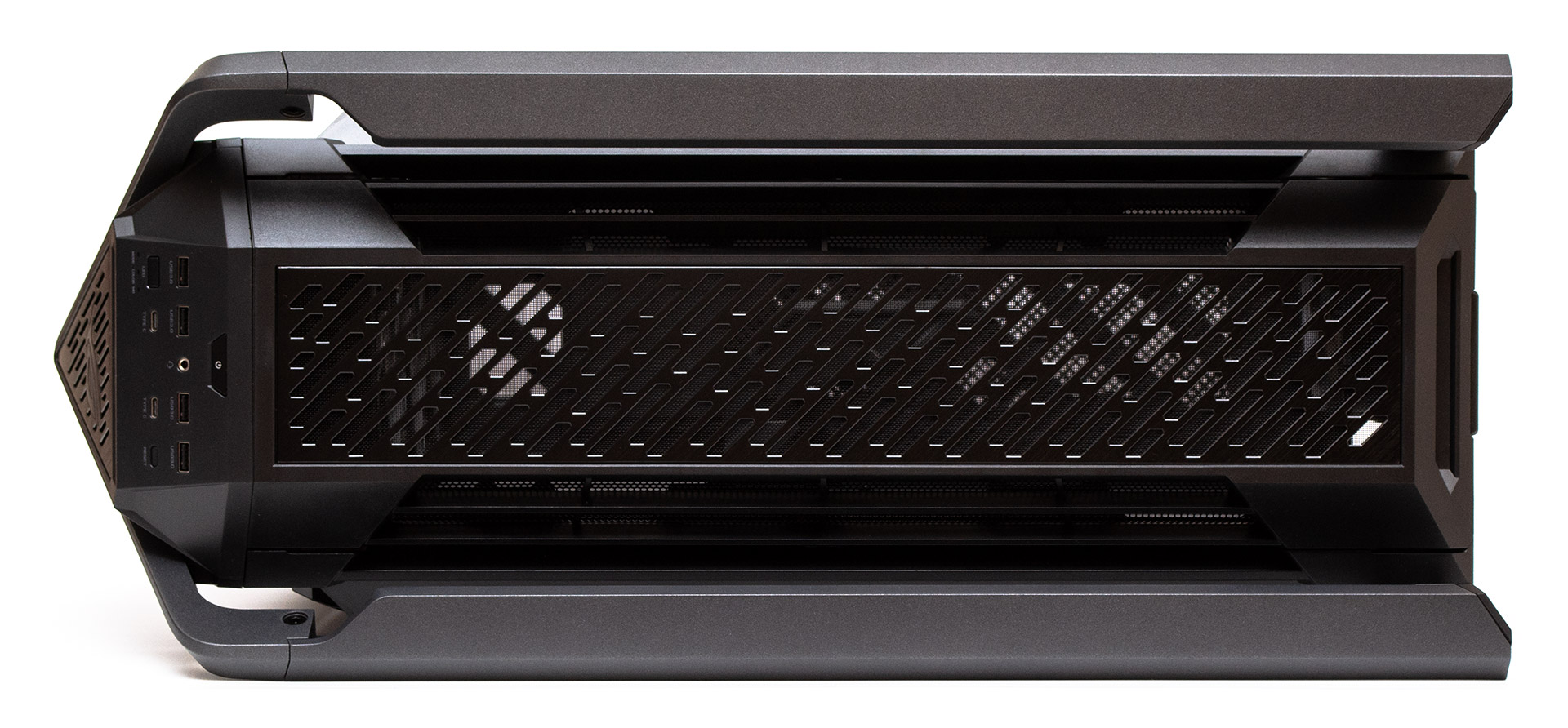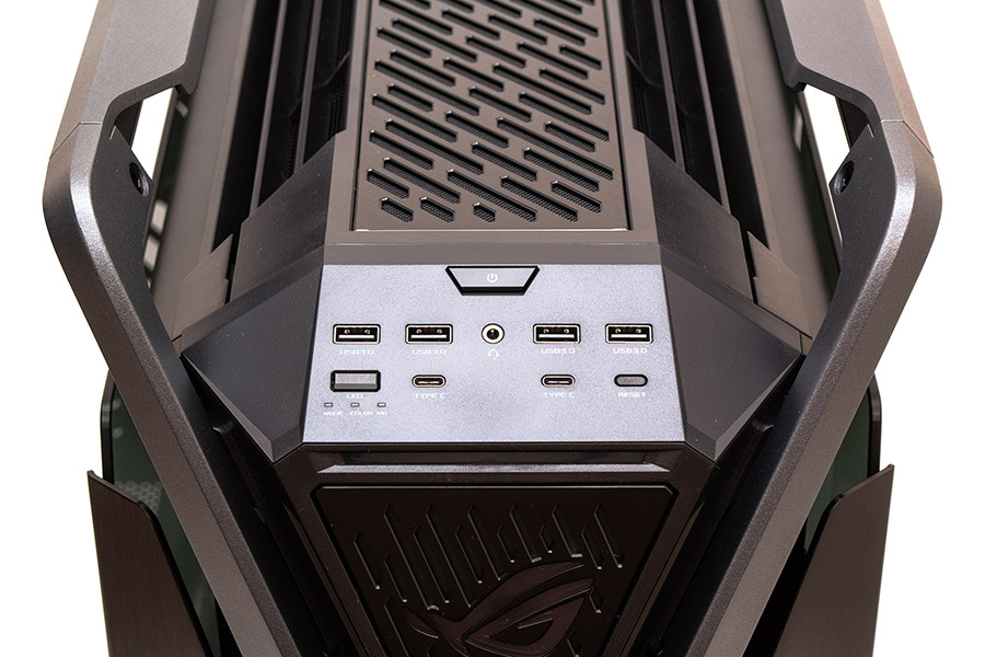 Зовнішні порти та кнопки зручно розташовані на похилій верхній грані. По центру зверху є кнопка запуску системи. Нижче в один ряд та досить далеко один від одного розташовані роз’єми USB 3.2 Gen1 Type-А, між якими вбудований комбінований 3,5-мм аудіовихід на гарнітуру. В нижньому ряду зліва є перемикач підсвітки та три інформативні світлодіоди, які показують поточний режим підсвічування. Далі по сторонах облаштовані два порти USB 3.2 Gen2х2 Type-C і у правому нижньому кутку є маленька кнопка перезавантаження системи.
