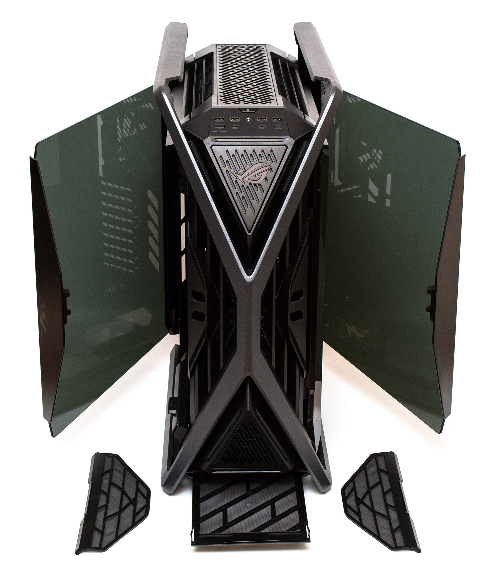 Бокові панелі тримаються попереду на магнітах, та легко відкриваються в сторони на кут під 90 градусів. Так само легко їх можна зняти догори з двох шарнірів, що перетворить корпус на відкритий стенд. Повітря може поступати всередину через отвори майже з усіх сторін. Але виробник все одно зробив знімні сіткові пилові фільтри передньої та нижньої панелі. Два передніх фільтри виймаються з боків. Нижній висувається вперед.