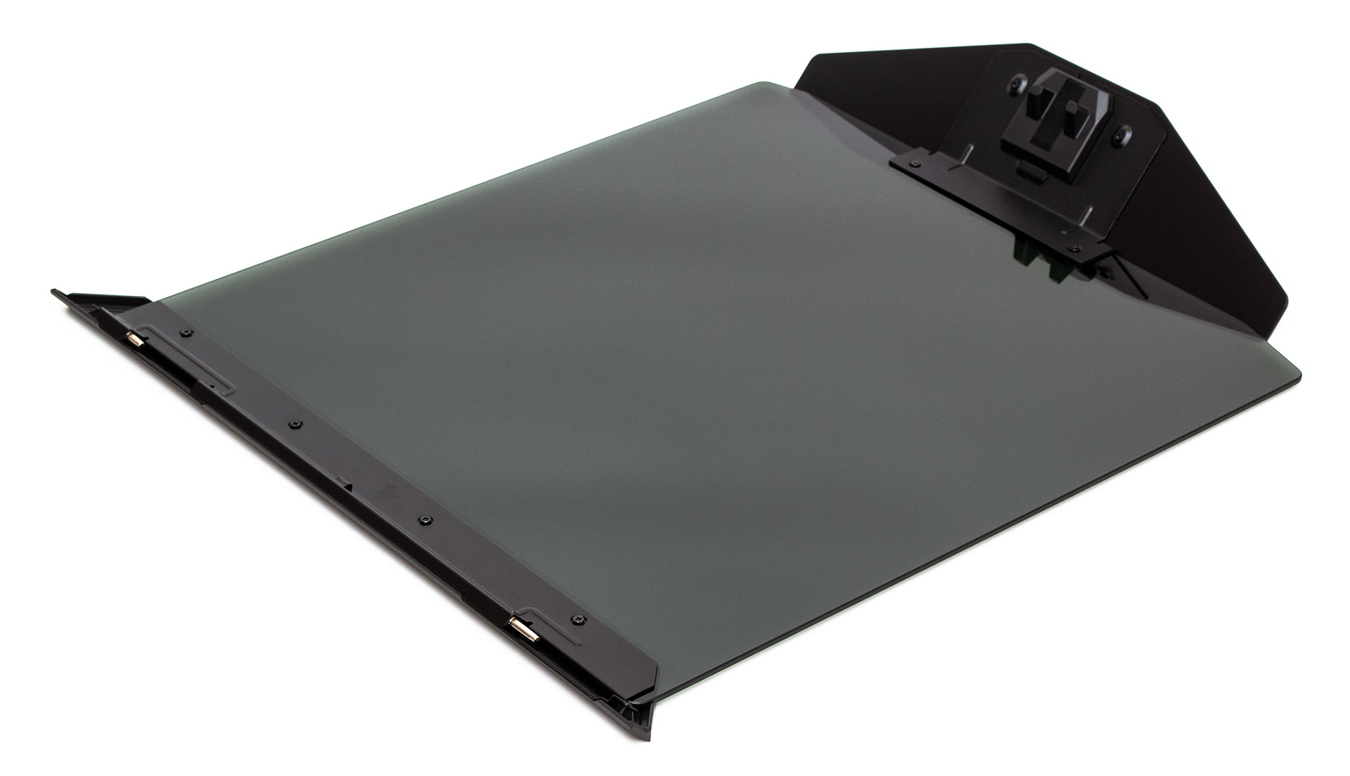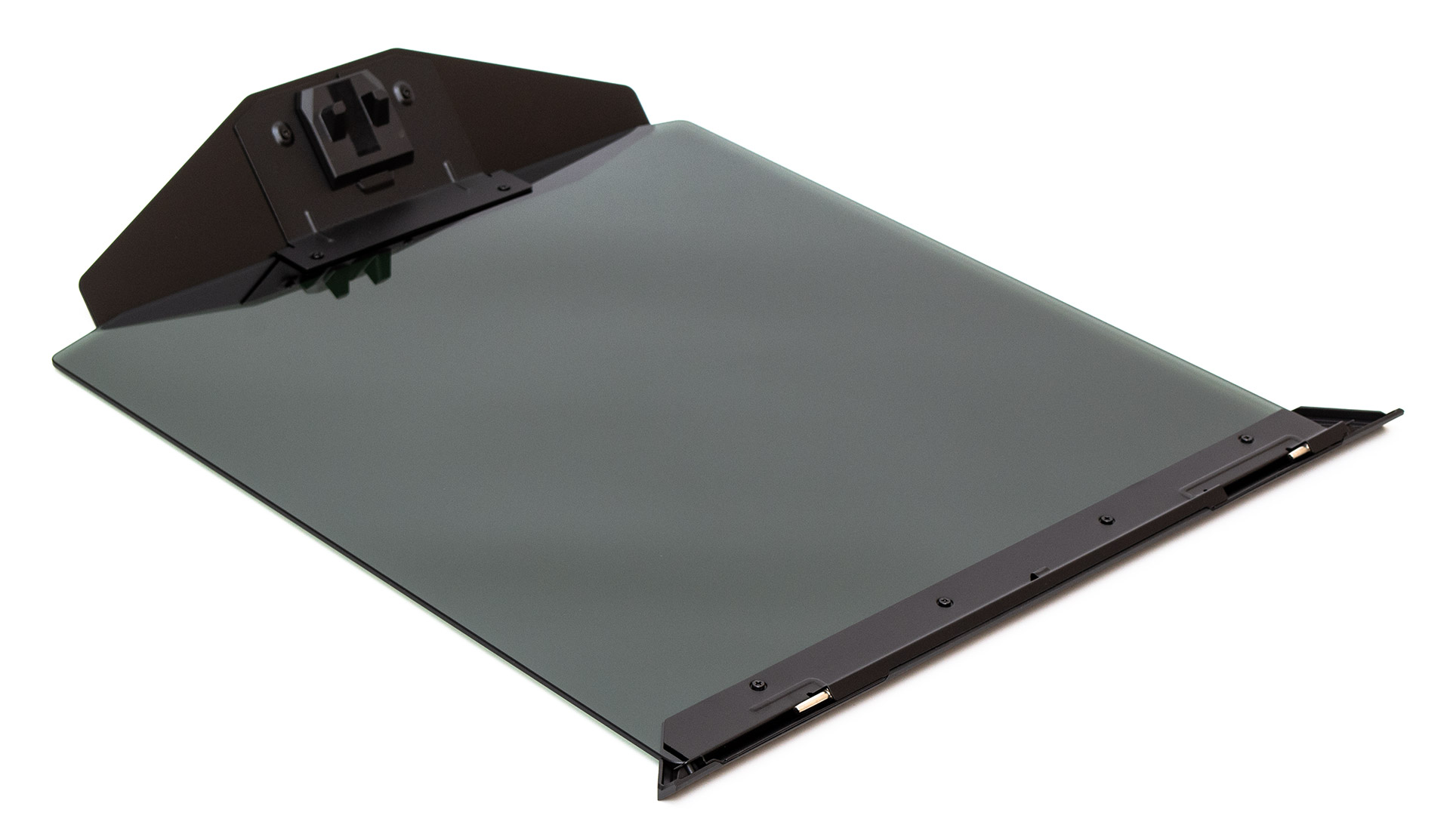 На звороті бачимо, що скло прикручене до металу наскрізними гвинтами, має дві петлі позаду та виступ з магнітами попереду. Вага цієї деталі складає 3,5 кг, що важче за деякі сучасні корпуси.