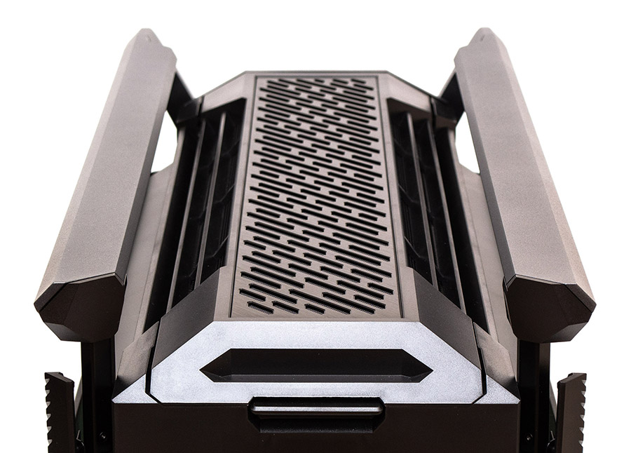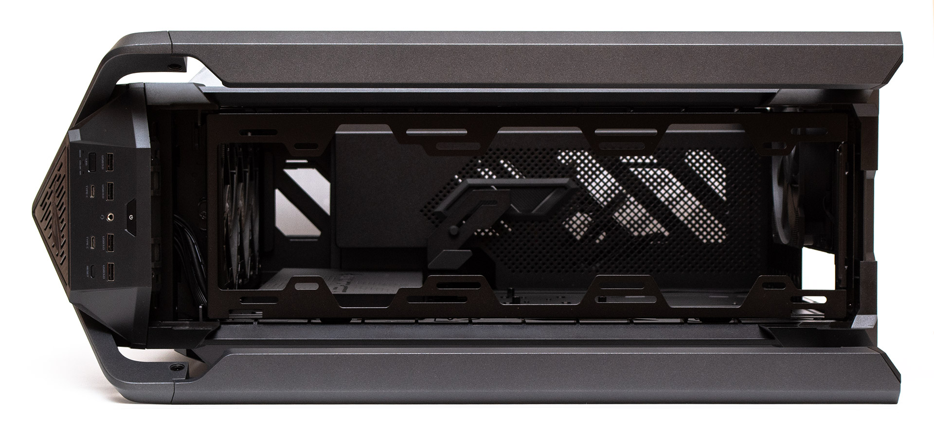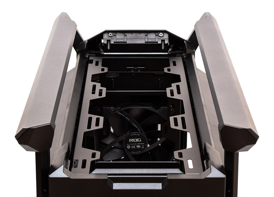 Достатньо натиснути на кнопку позаду та потягнути панель назад і догори. Отримуємо повний доступ до верхньої рамки кріплення вентиляторів.