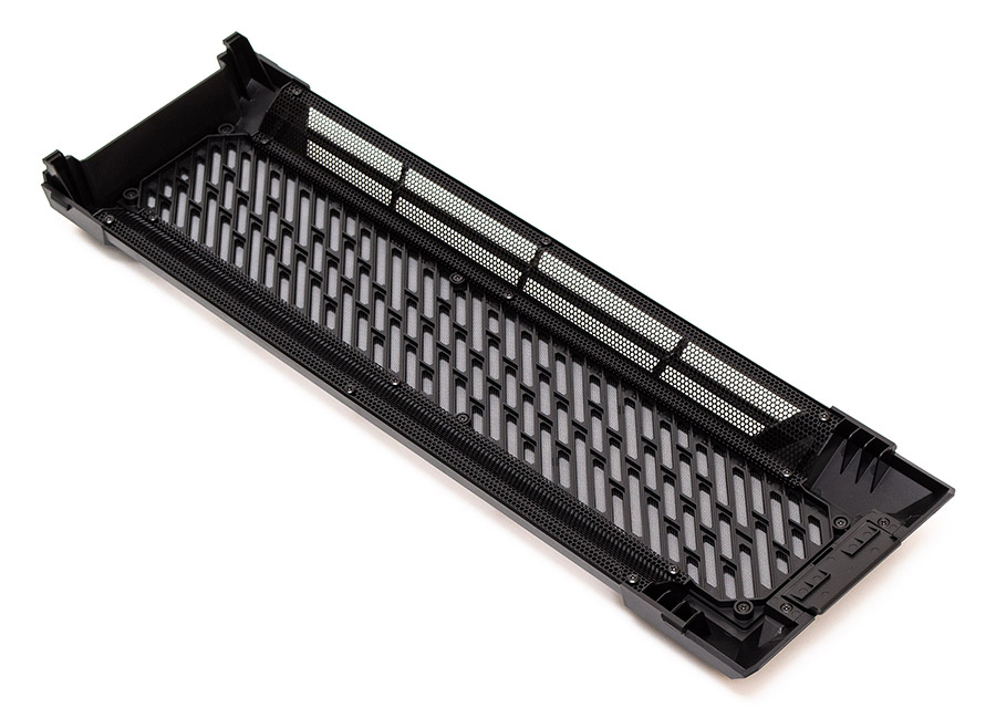 Кришка верхньої панелі виготовлена з пластику. Бокові грані вкриті металевою сіткою з великим отворами, а зверху маємо решітку з меншими отворами, що гарно пропускає повітря та трохи затримує пил.