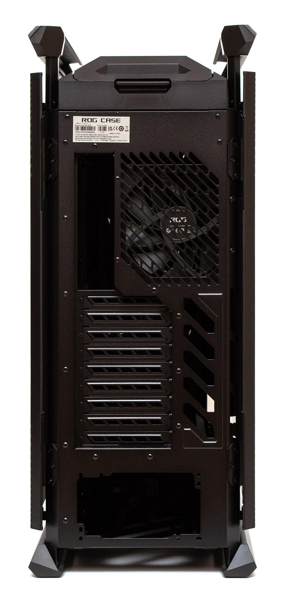 На задній панелі є вентиляційна решітка з дуже широкими діагональними отворами, за якими видно 140-мм витяжний вентилятор (за необхідності його можливо замінити на 120-мм модель). Нижче є дев’ять слотів розширення PCI, закритих вентильованими багаторазовими заглушками. Якщо зняти нижніх шість з них, сюди можна буде прикрутити комплектний адаптер для вертикального розташування відеоадаптера. Навпроти слотів справа є додаткові вентиляційні отвори. А у самому низу розташоване посадкове місце для блока живлення, який можна орієнтувати як вентилятором догори, так і униз.