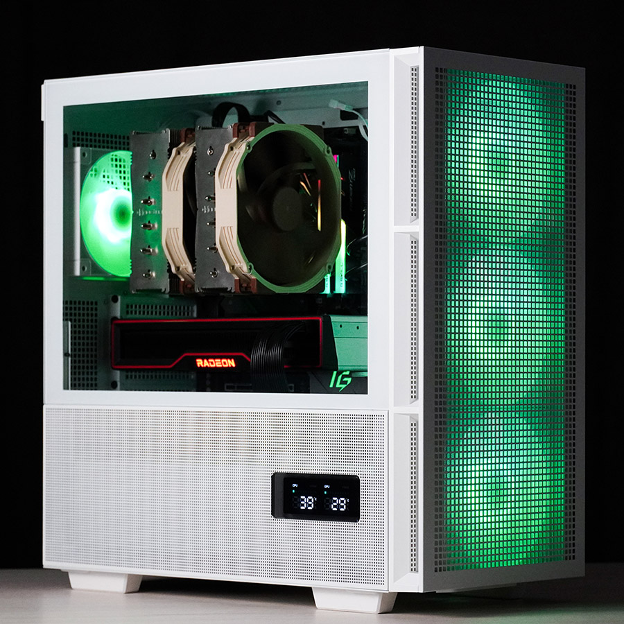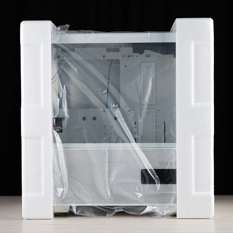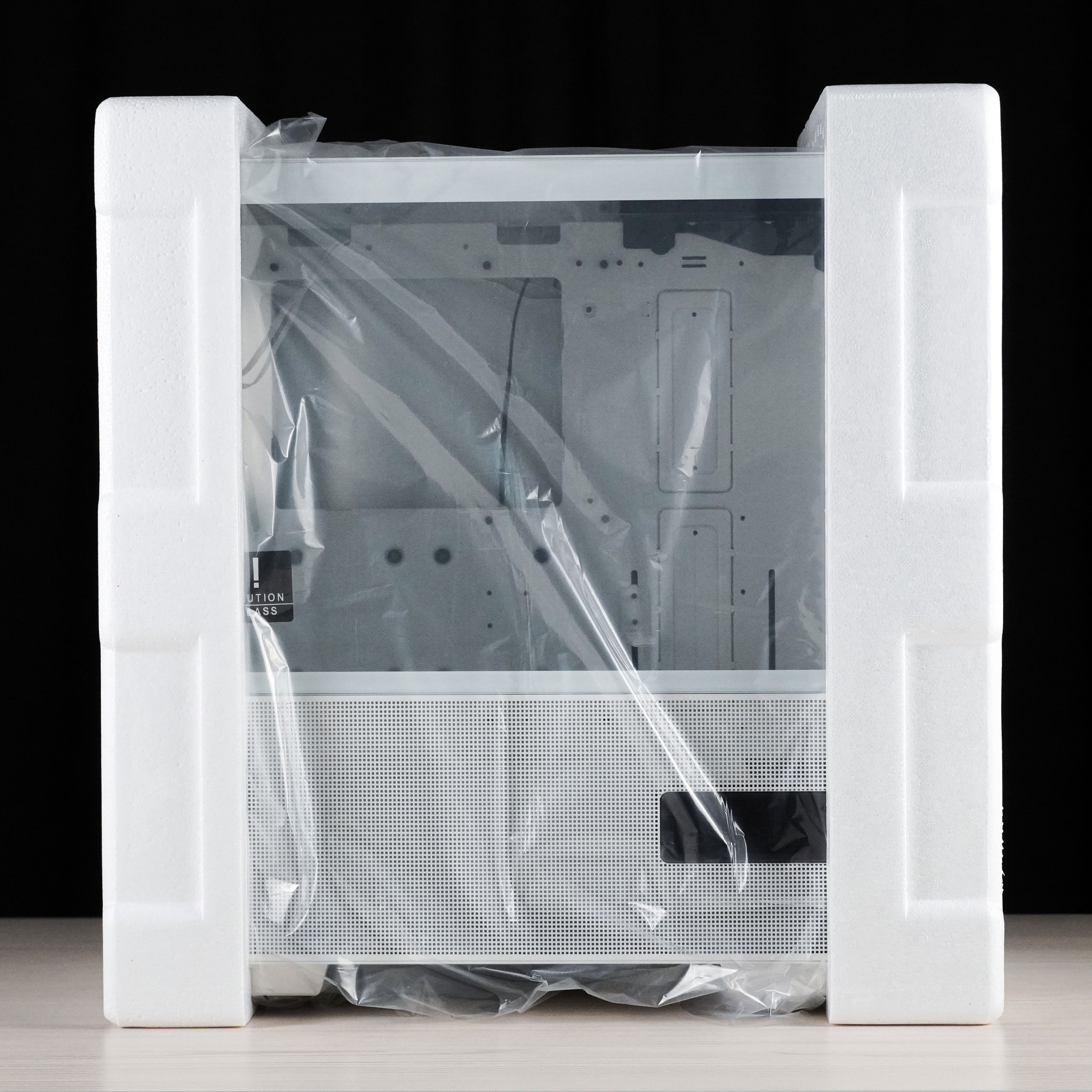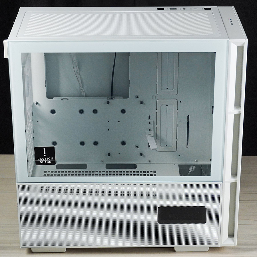Ліва панель корпусу виготовлена зі скла та перфорованого металу, що надає можливість візуального доступу до компонентів у верхній частині, та сприяє притоку свіжого повітря знизу.