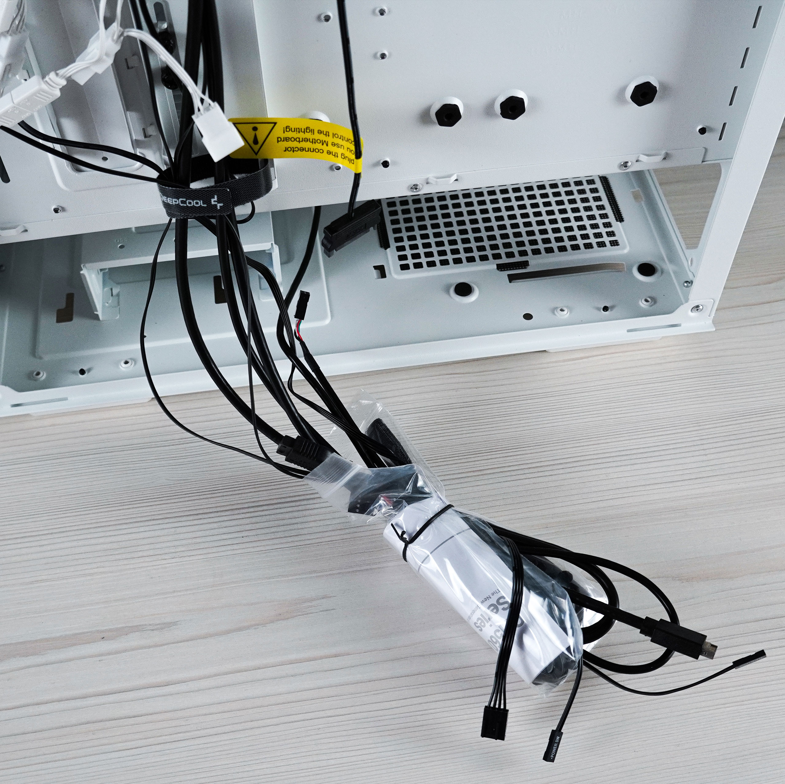 Пакетик з комплектним приладдям знаходиться під кожухом блока живлення, закріплений до кабелів.
