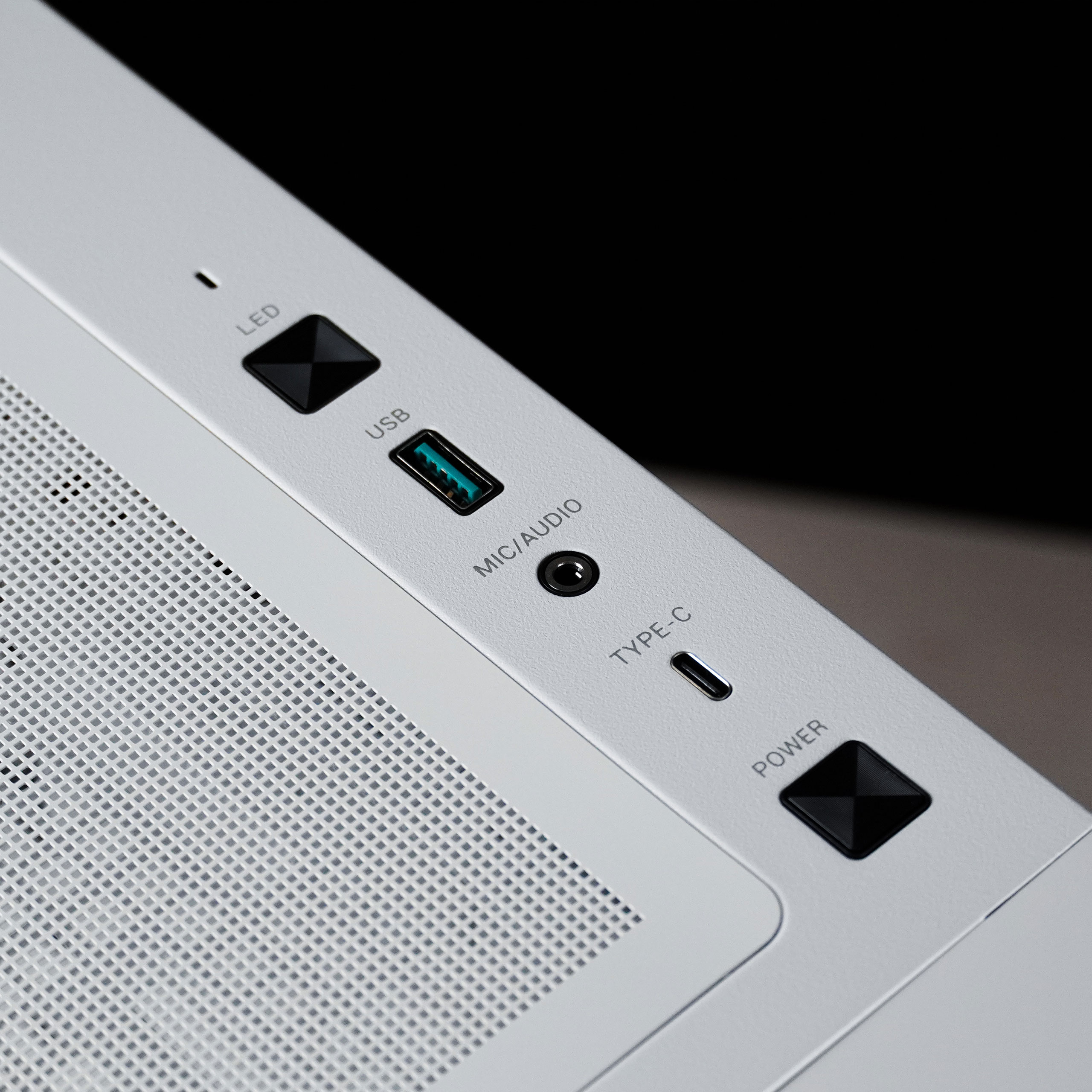 Також зверху розташовані органи керування та зовнішні порти, а саме кнопка керування підсвіткою внутрішнього ARGB-контролера, комбінований 3,5-мм мініджек, порти USB Type-C та USB 3.0 й нарешті кнопка вмикання ПК.
